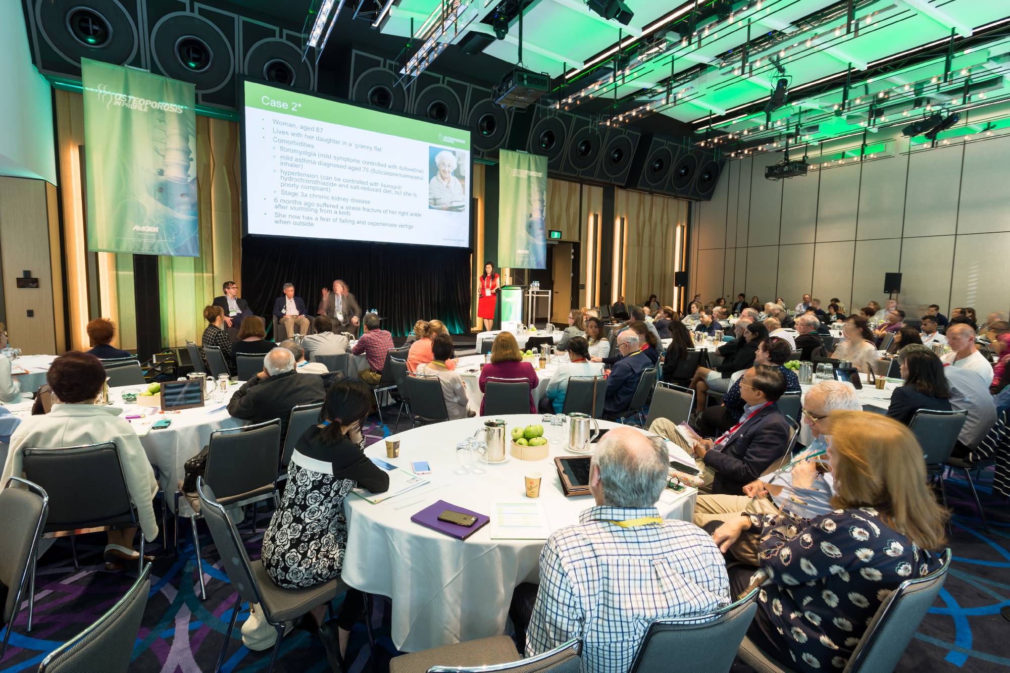 At the Hyatt Regency Sydney, we gave the client a great cost effective solution, we use a projector from the back of the room with long throw a lens, we also lit the stage with ground supported truss, another saving for the client.